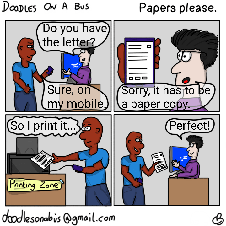 Papers please! doodlesonabus Comic September 14, 2019September 14, 2019 1 Minute Not saying which office or company this is, but it is based on a true story! Share this: Click to share on X (Opens in new window) X Click to share on Facebook (Opens in new window) Facebook Like Loading... Published by doodlesonabus I like to draw about the craziness of life. Sometimes there will be things imagined, however mostly it is things we see all the time and maybe never notice. I am not a professional artist, I just have fun with it. View all posts by doodlesonabus Published September 14, 2019September 14, 2019