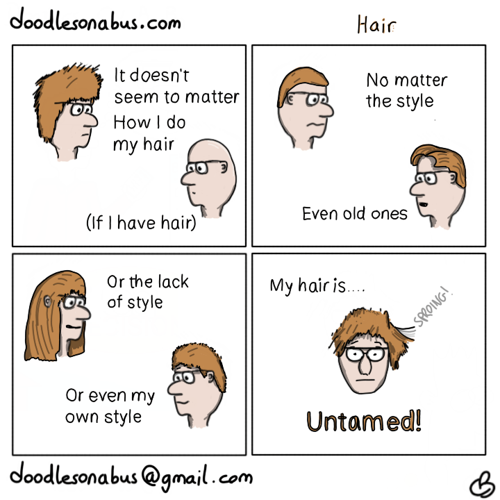 Hair doodlesonabus Comic November 30, 2019 1 Minute It is true! I have tried all different styles over the years and it just becomes this mess! Share this: Click to share on X (Opens in new window) X Click to share on Facebook (Opens in new window) Facebook Like Loading... Published by doodlesonabus I like to draw about the craziness of life. Sometimes there will be things imagined, however mostly it is things we see all the time and maybe never notice. I am not a professional artist, I just have fun with it. View all posts by doodlesonabus Published November 30, 2019